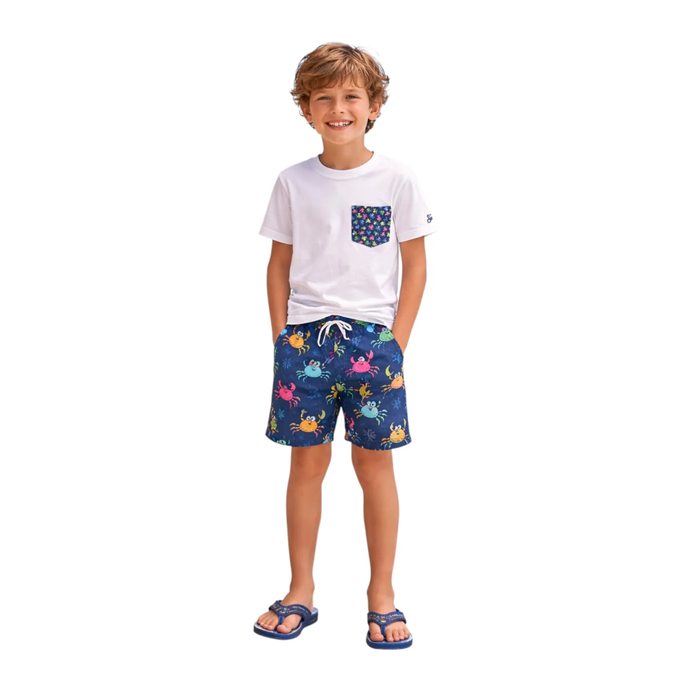 Costume bambino modello boxer di media lunghezza firmato St Barth Mc2 dallo stile dinamico e contemporaneo pensato per accompagnare le giornate estive con comfort leggerezza e personalità Vita elasticizzata con coulisse regolabile per una vestibilità pratica e sicura tasche laterali funzionali e tasca posteriore con chiusura magnetica dettagli curati e fantasia retrò dal carattere vivace Tessuto ad asciugatura rapida ideale per mare piscina e tempo libero capo sempre attuale e di forte identità stilistica.