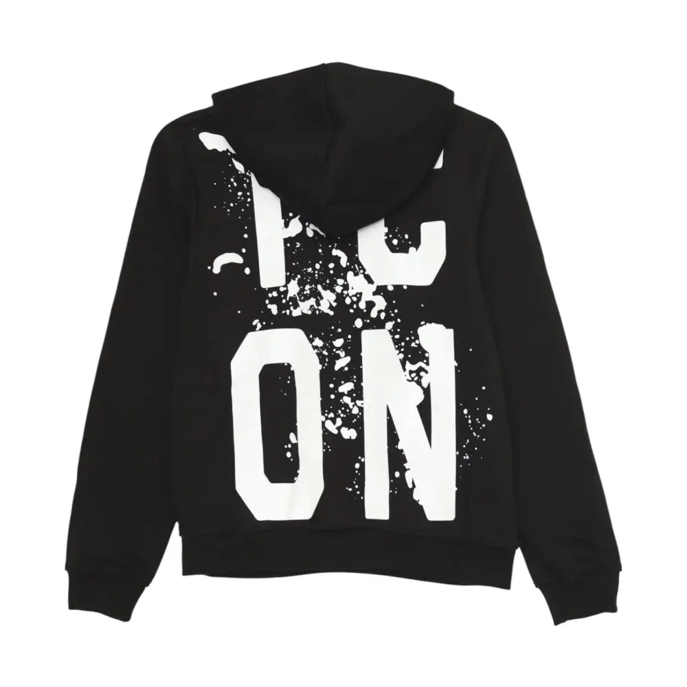 in cotone garzato, modello girocollo con cappuccio e tasca marsupio, scritta stampata a lato del petto e dietro.
