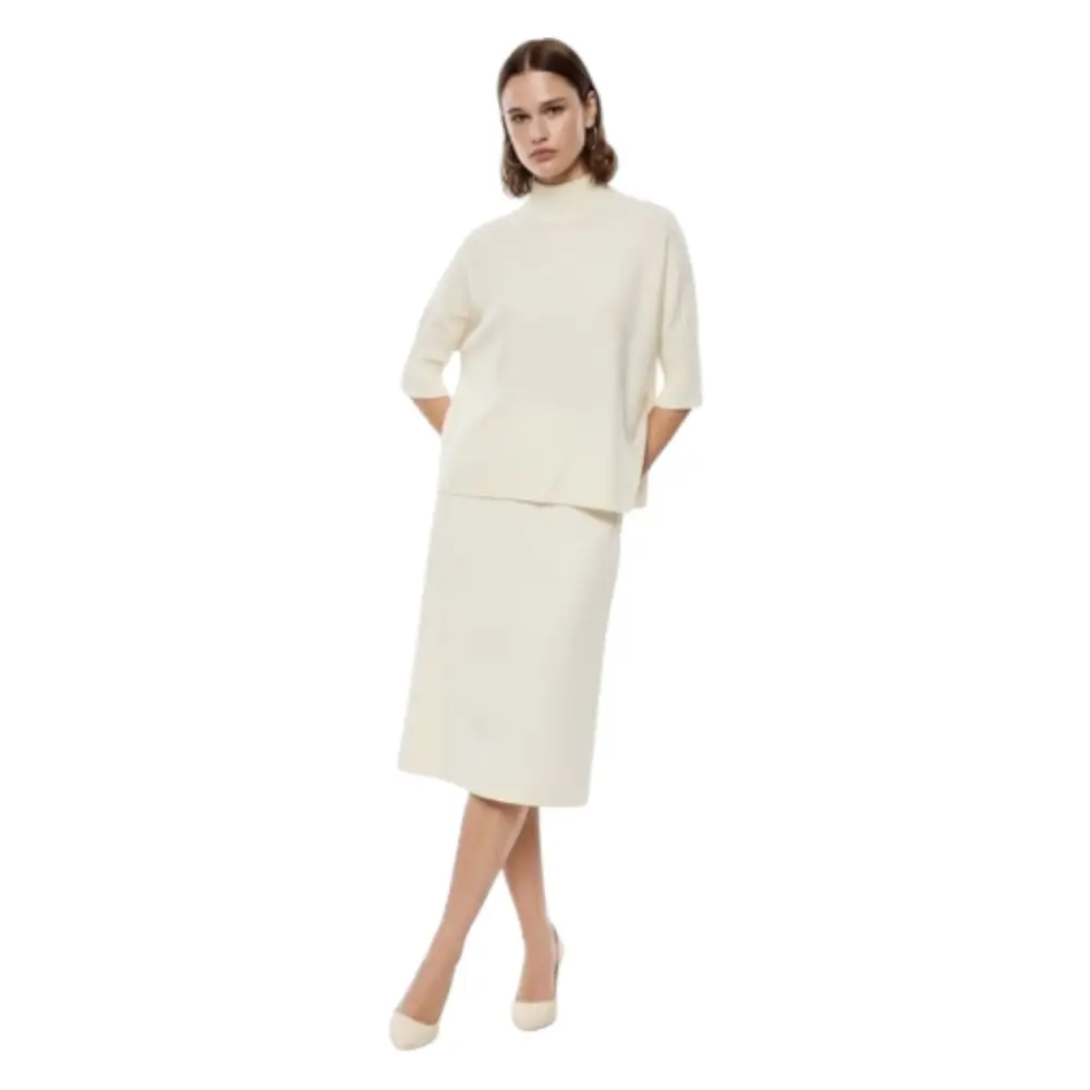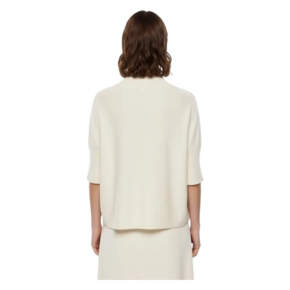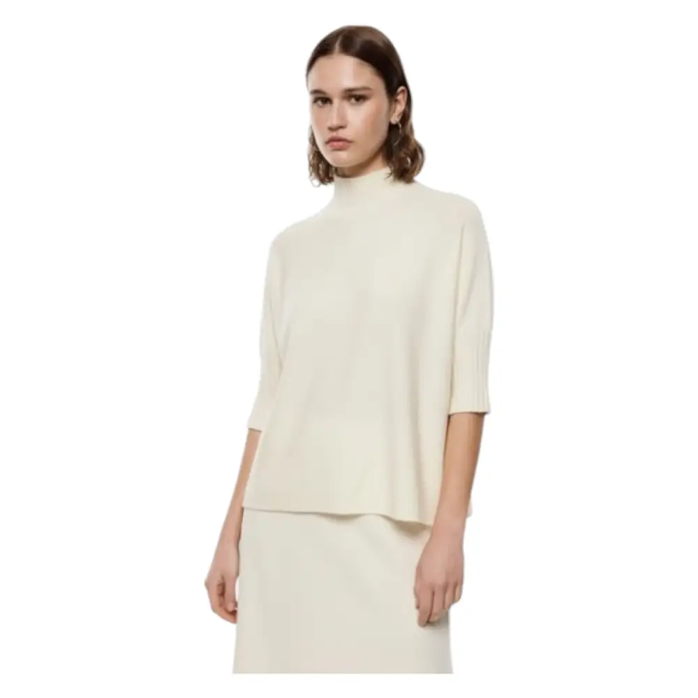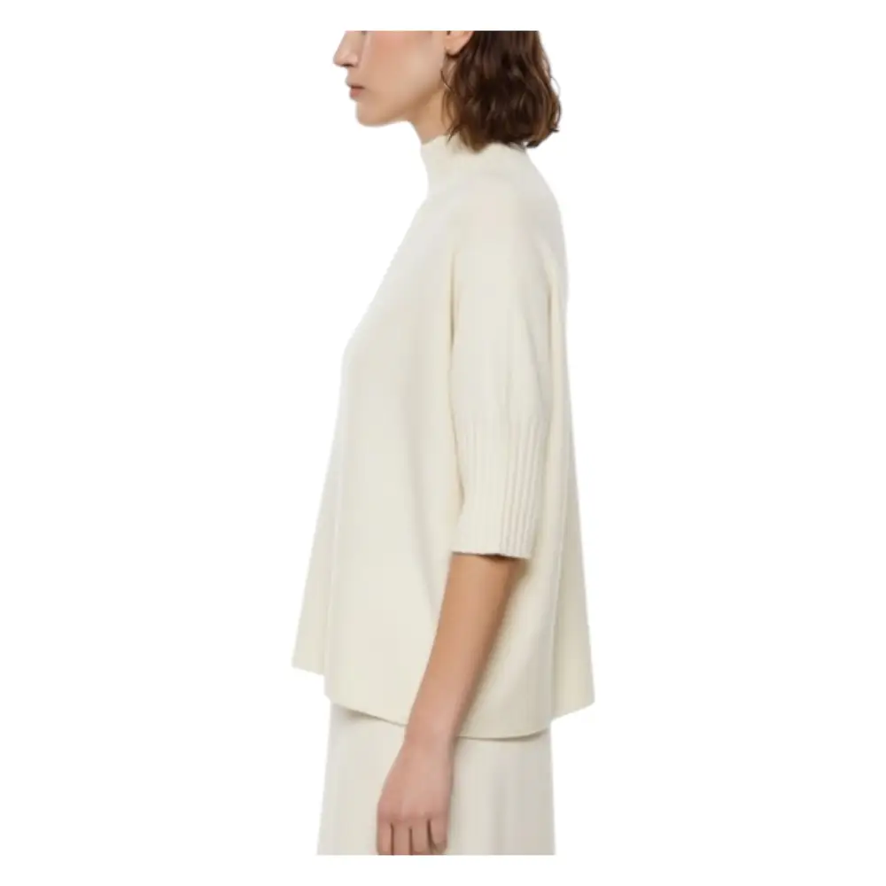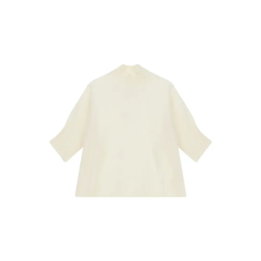 Proposta sofisticata dal taglio contemporaneo, questo maglione a collo alto e maniche a mezzo braccio offre una silhouette rilassata, valorizzata da lavorazione a maglia rasata e dettagli a coste su collo, fondo e maniche. Perfetto per arricchire guardaroba urbani con versatilità e stile personale.