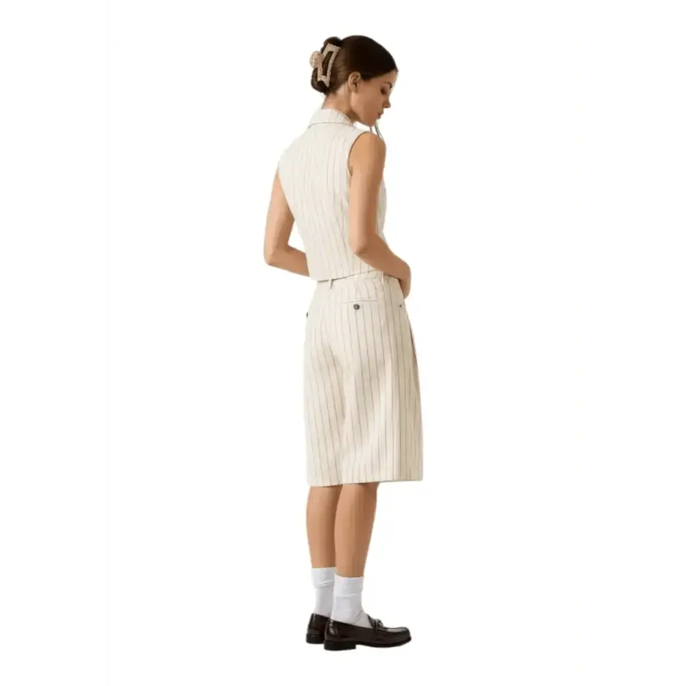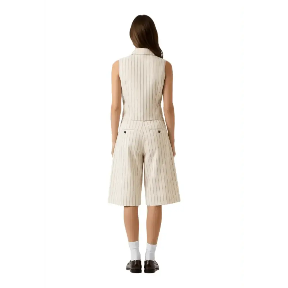 Il design smanicato con colletto e chiusura frontale con bottoni richiama uno stile essenziale dal gusto sartoriale, mentre il taglio corto valorizza la silhouette con un tocco trendy.