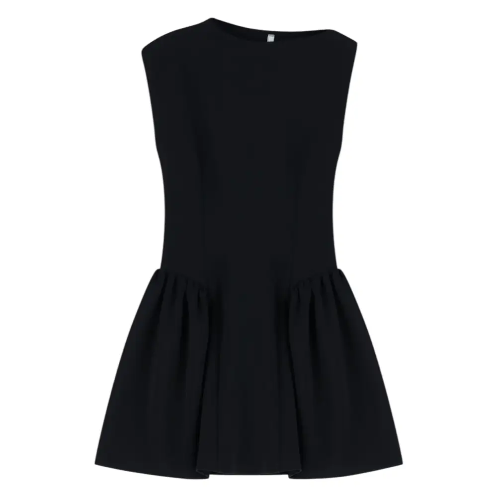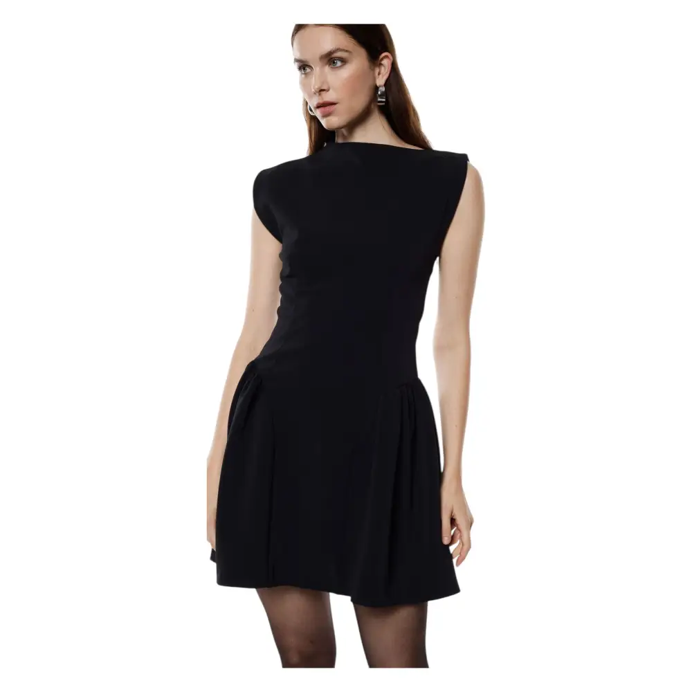 Abito corto dalla linea svasata, valorizzato da un raffinato scollo barca e costruzione senza maniche. La silhouette contemporanea, arricchita da dettagli drappeggiati laterali, interpreta con versatilità le esigenze di un pubblico metropolitano attento alle tendenze. Ideale per creare outfit originali e distintivi.