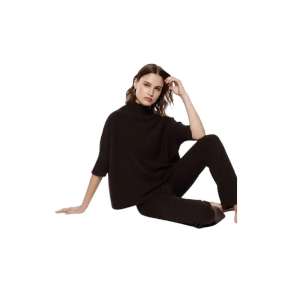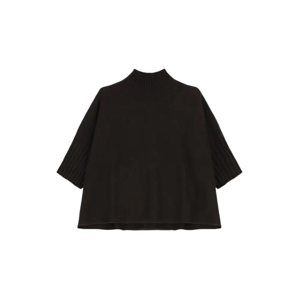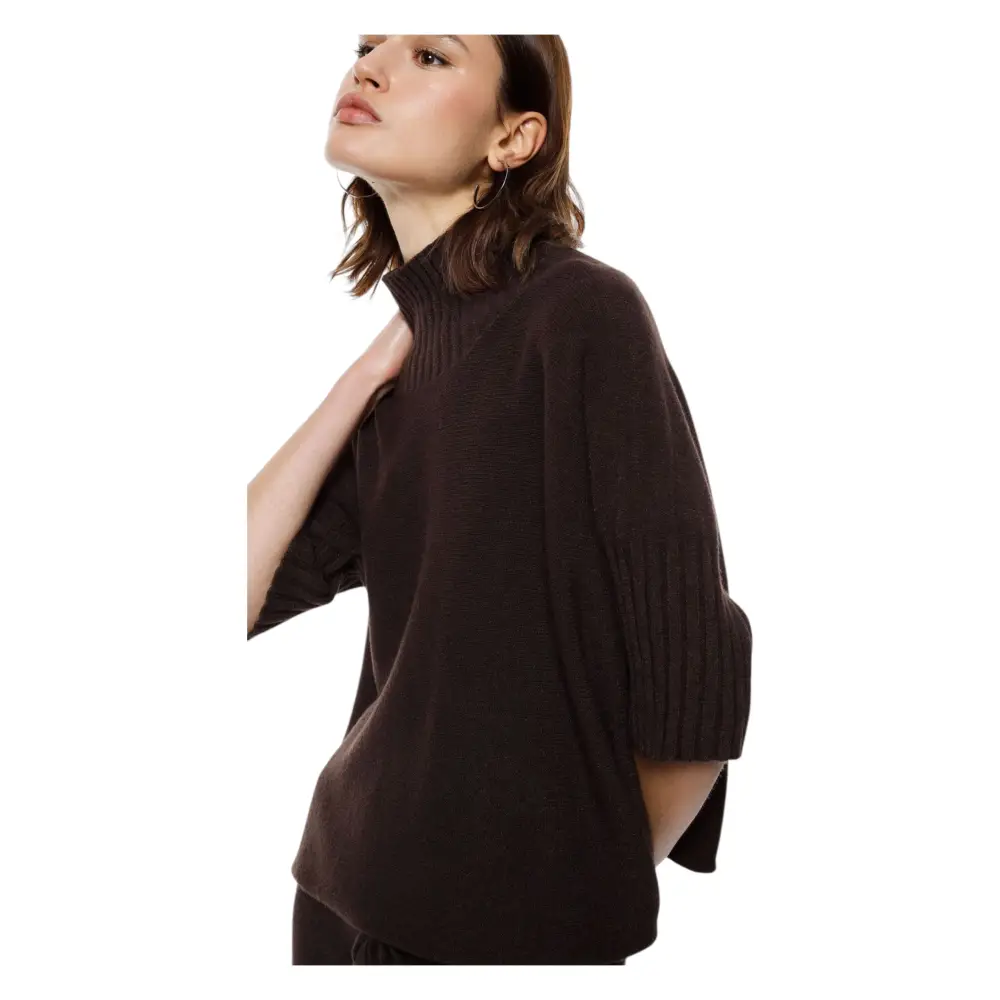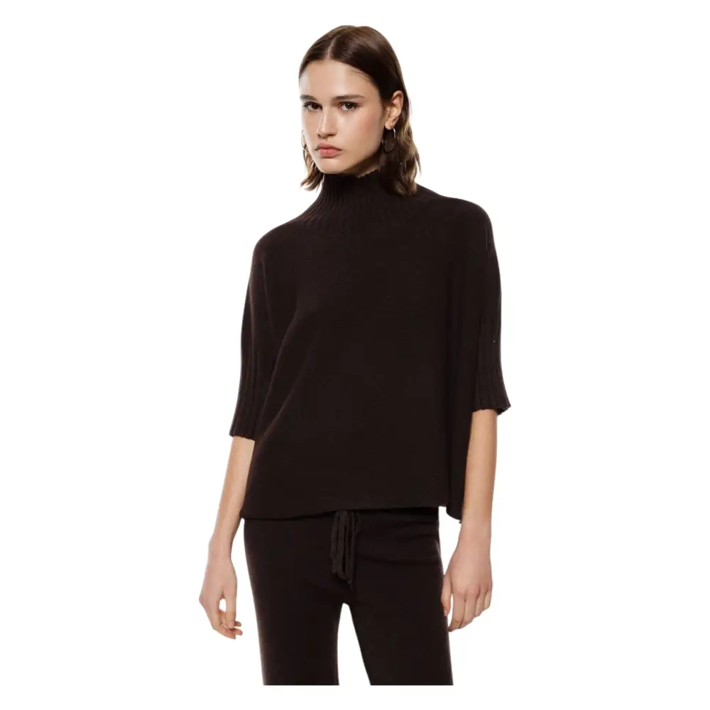 Proposta sofisticata dal taglio contemporaneo, questo maglione a collo alto e maniche a mezzo braccio offre una silhouette rilassata, valorizzata da lavorazione a maglia rasata e dettagli a coste su collo, fondo e maniche. Perfetto per arricchire guardaroba urbani con versatilità e stile personale.