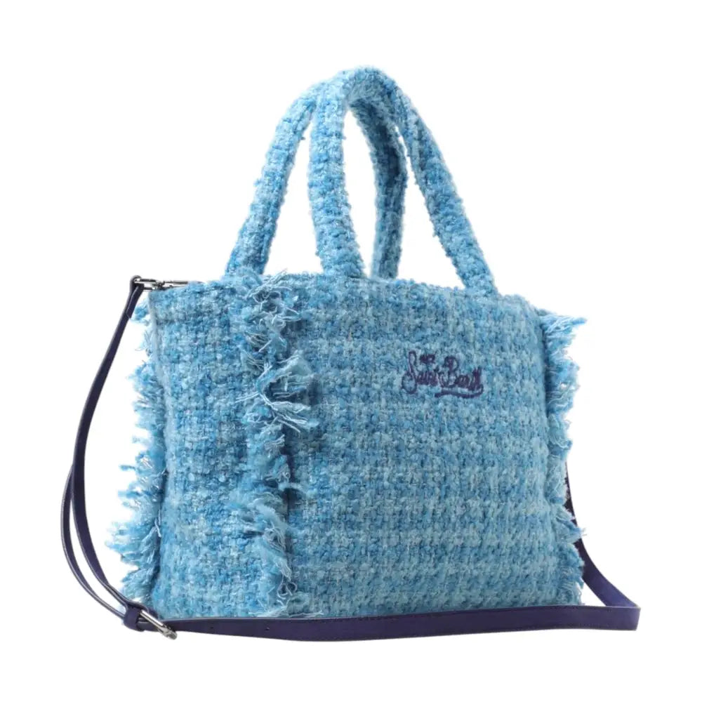 Borsa a mano realizzata in tweed con frange lungo il profilo, tracollina regolabile e rimovibile.