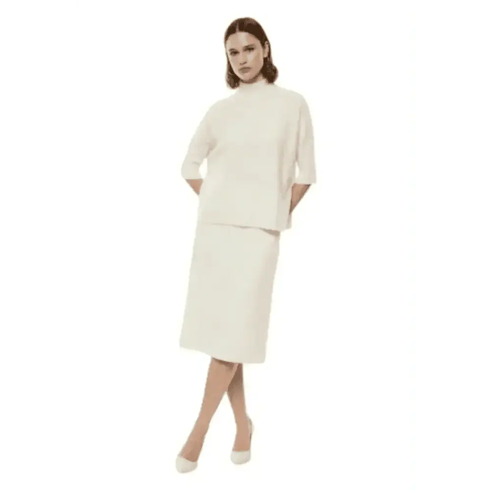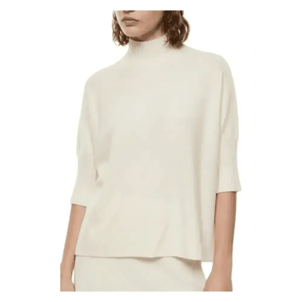 Proposta sofisticata dal taglio contemporaneo, questo maglione a collo alto e maniche a mezzo braccio offre una silhouette rilassata, valorizzata da lavorazione a maglia rasata e dettagli a coste su collo, fondo e maniche. Perfetto per arricchire guardaroba urbani con versatilità e stile personale.