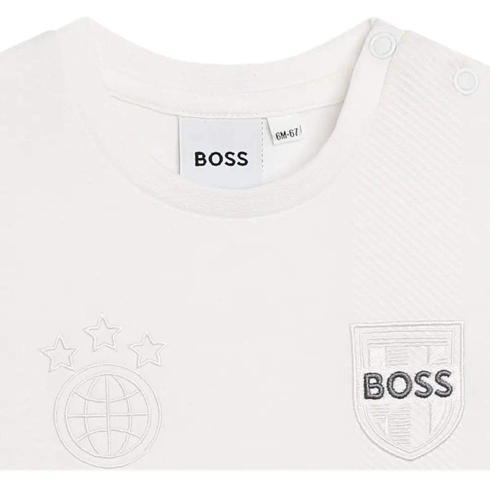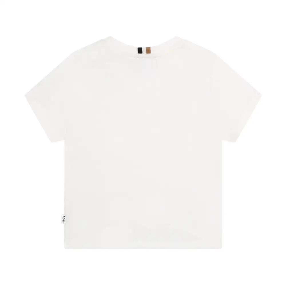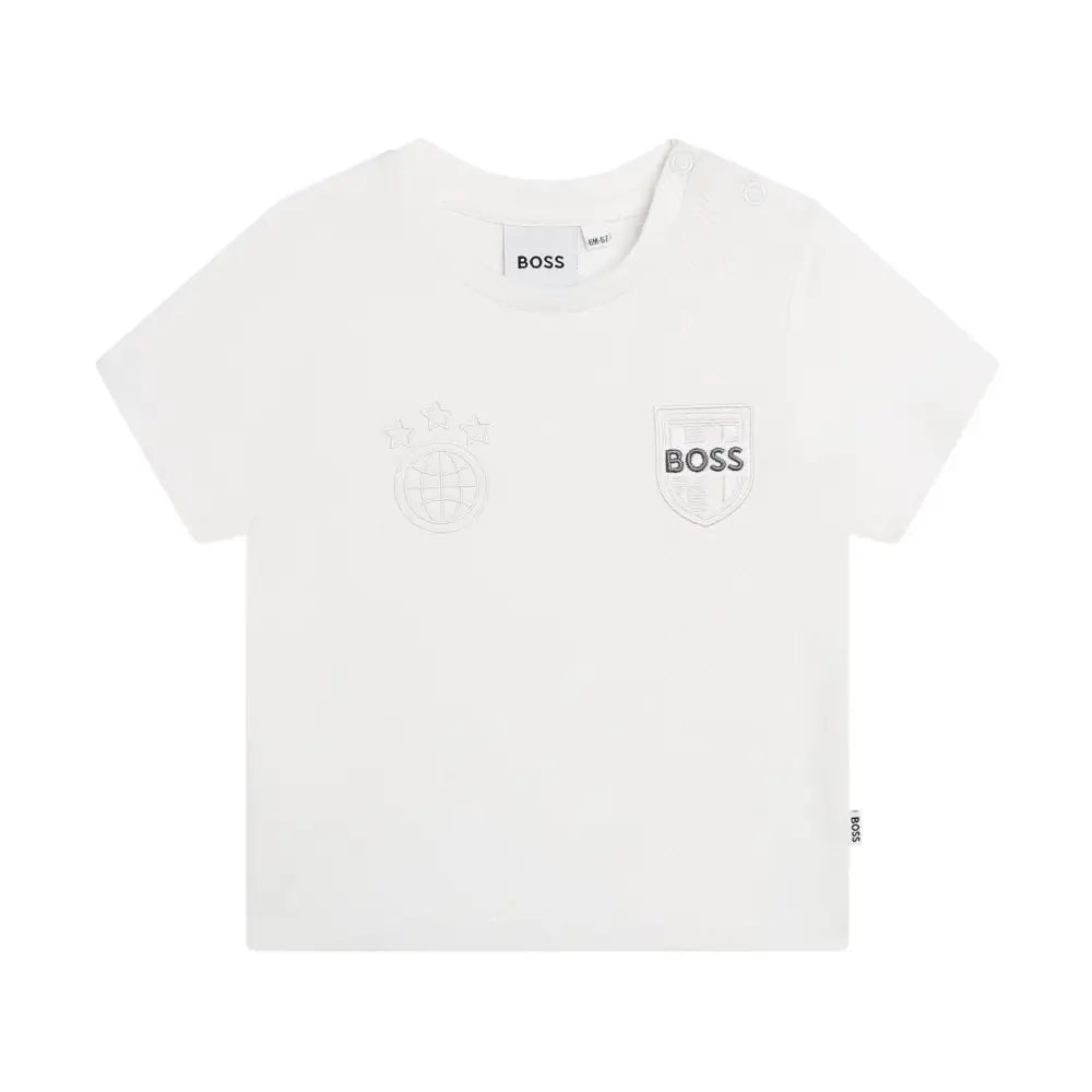 T-shirt a maniche corte in jersey 100% cotone, chiusura a scatto sulle spalle, distintivi ricamati, etichetta intrecciata sul lato, striscia iconica sul collo posteriore.