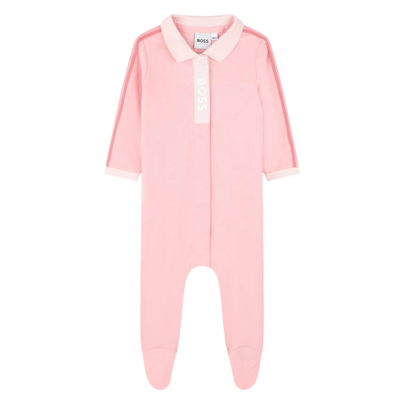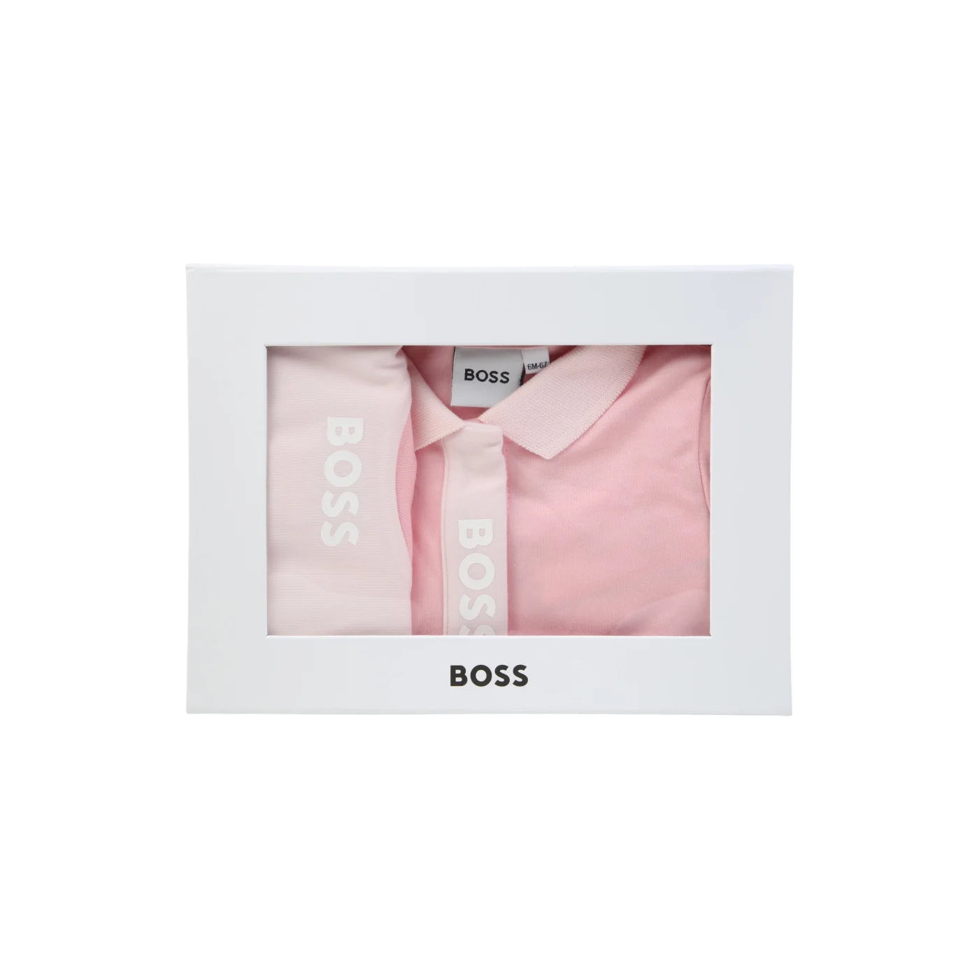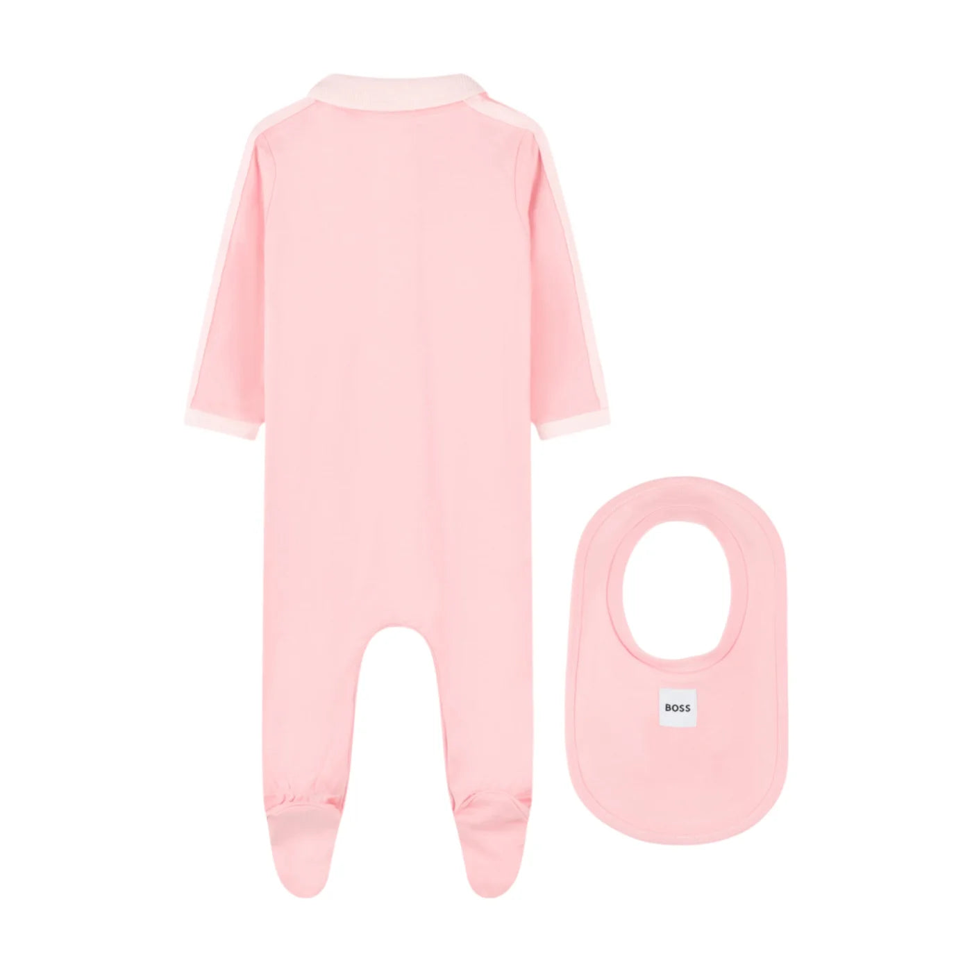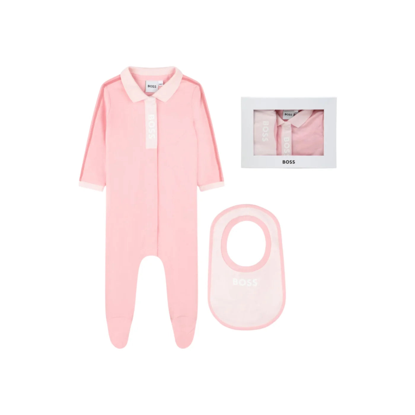 Questo set BOSS è un must per i neo genitori. Presenta un pigiama con colletto in stile polo chiuso con abbottonatura a pressione sul davanti e un bavaglino decorato con bordo a costine a contrasto. Realizzato in cotone biologico, il set è venduto in confezione regalo.