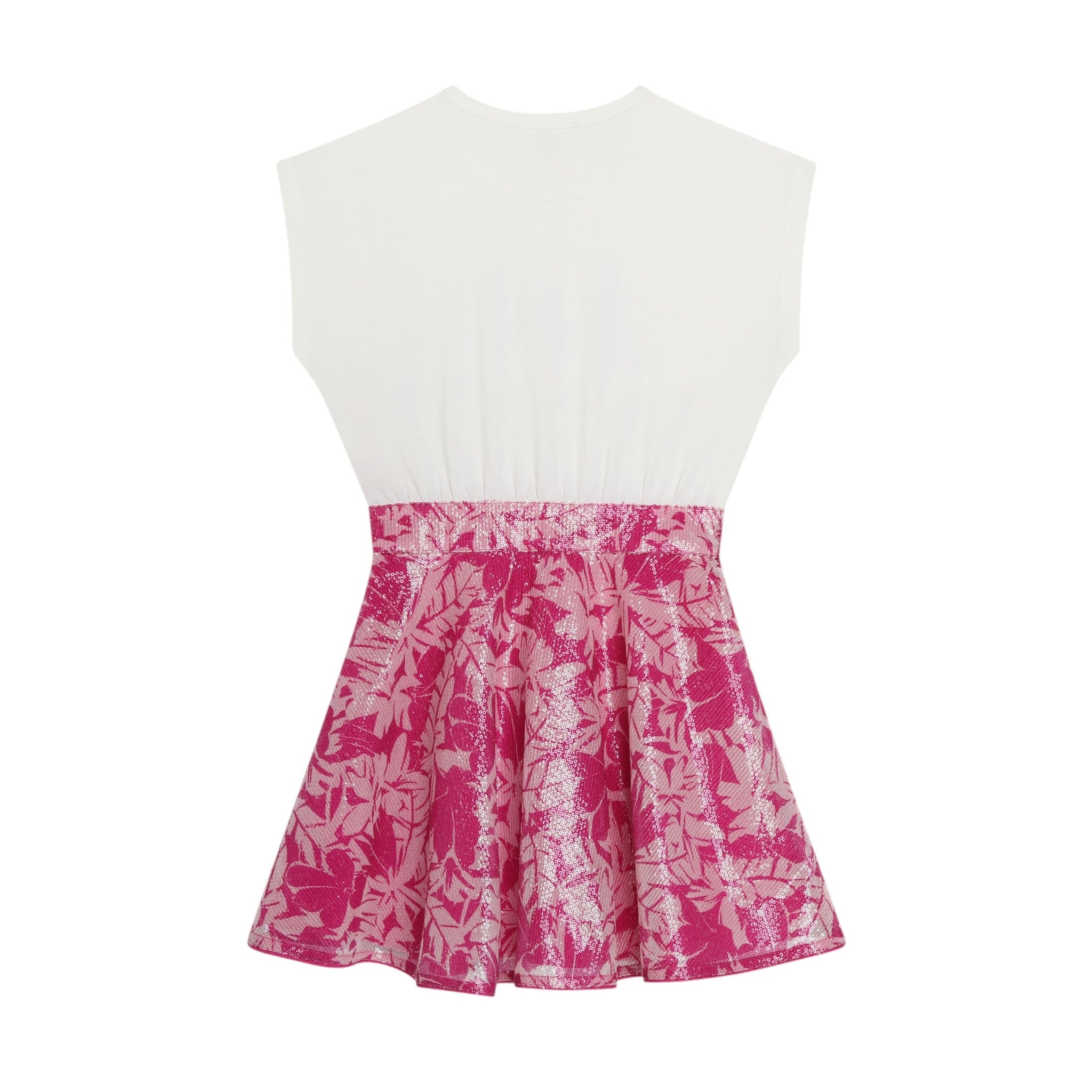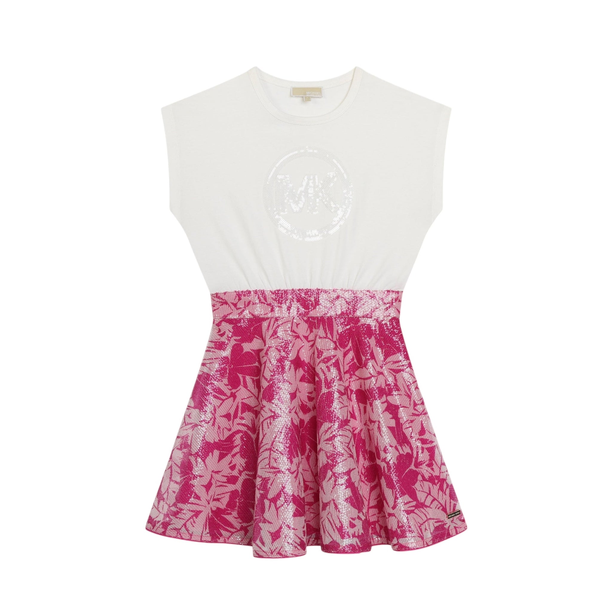 Questo abito MICHAEL KORS bimateriale è perfetto per le occasioni speciali. Caratterizzato da una parte superiore in tinta unita decorata con un logo in paillettes tono su tono e da una gonna skater stampata e ricamata con paillettes, è un modello con scollo rotondo e maniche corte.