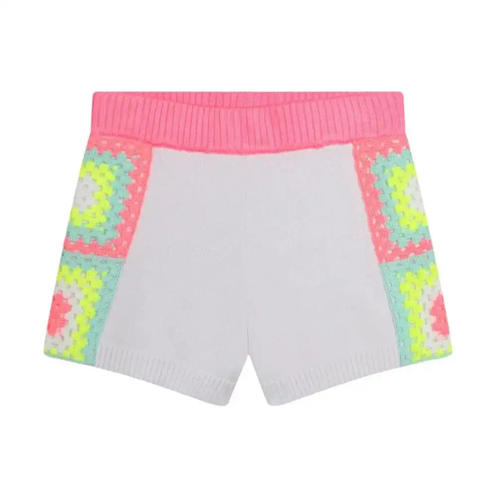 Pratici ed eleganti, questi pantaloncini da bambina Billieblush consentono di sentirsi a proprio agio in ogni circostanza. Si distinguono per il girovita elasticizzato a contrasto, mentre i lati sono decorati con dettagli colorati all'uncinetto. Il modello è realizzato in maglia di cotone.
