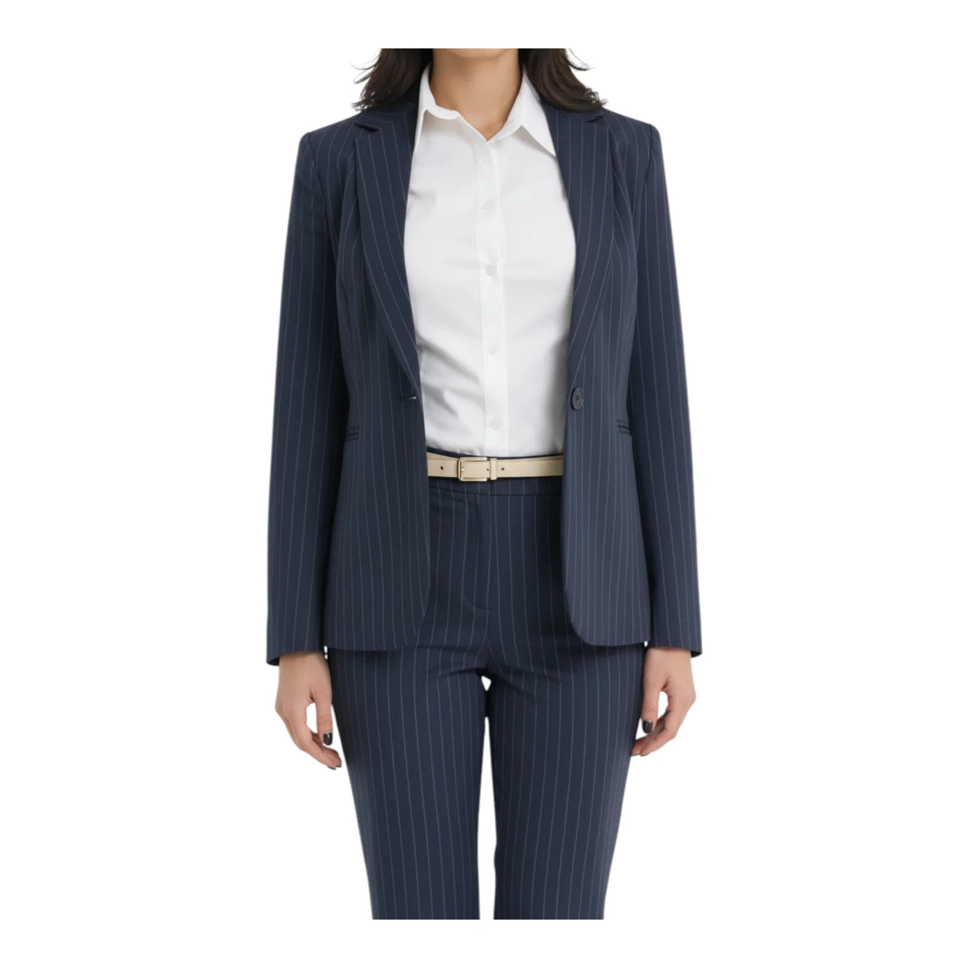 Il colore blu, arricchito dal motivo a righe, lo rende ideale per outfit business e smart casual, perfetto da abbinare ai pantaloni coordinati o a capi più casual per un contrasto moderno.