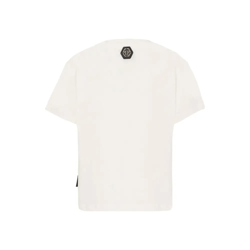 T-shirt avorio realizzata in jersey di cotone, con maniche corte e girocollo a costine. È decorata con logo di strass sulla parte anteriore e logo in metallo sul retro.