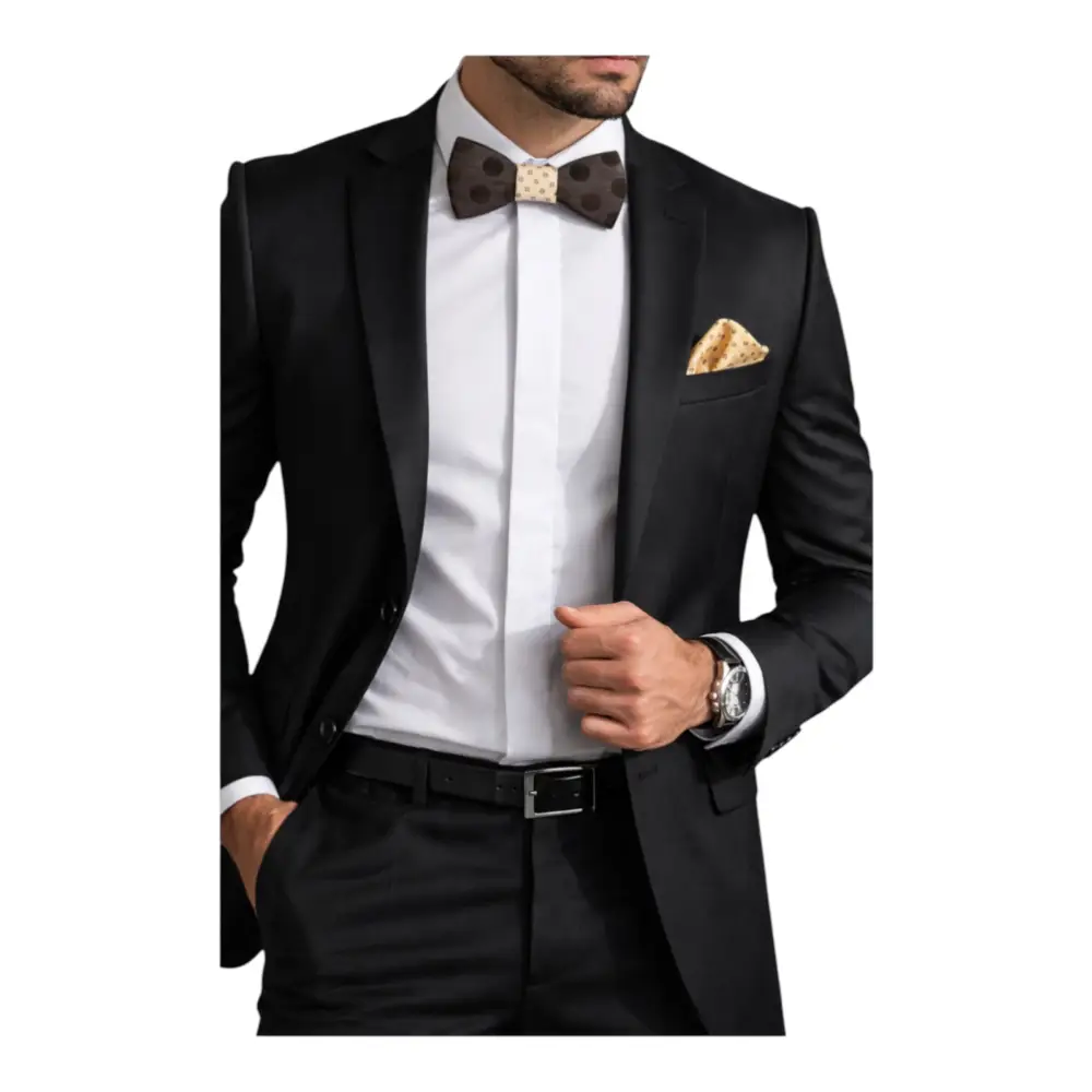 Il papillon in legno dona un tocco unico e contemporaneo, mentre il fazzoletto da taschino coordinato completa il look con armonia ed eleganza. Il set è presentato in confezione, perfetto anche come idea regalo.