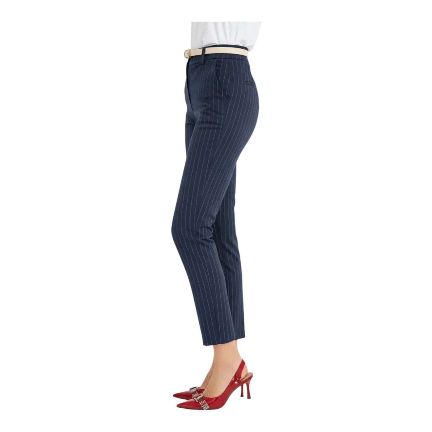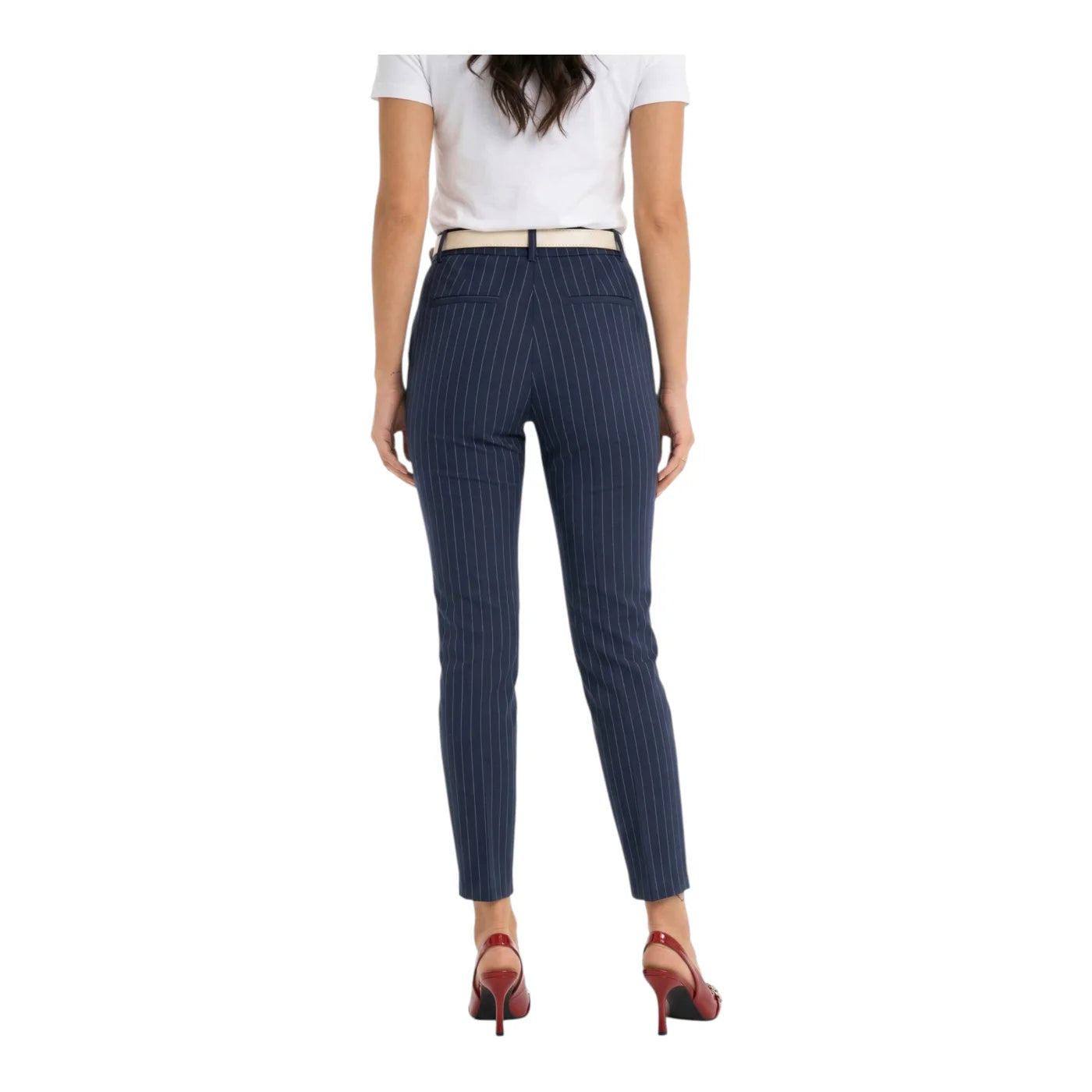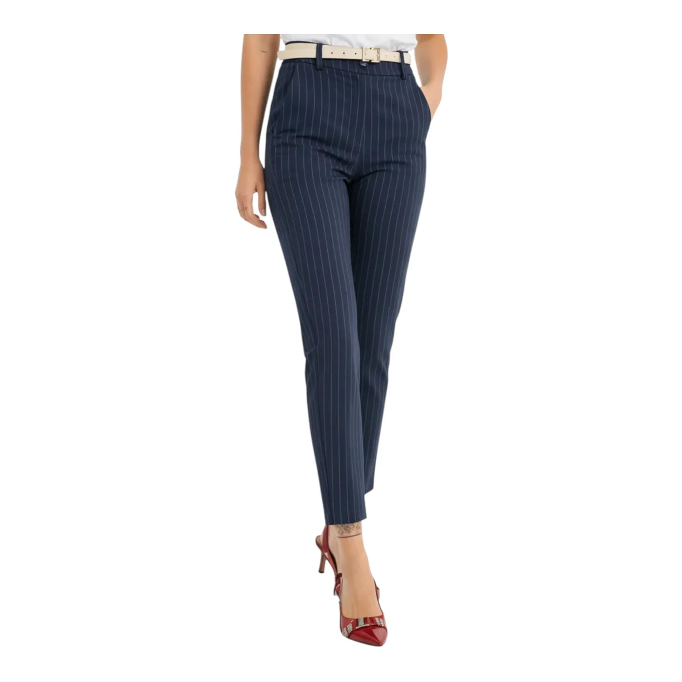 Il colore blu, arricchito dal motivo a righe, li rende versatili e facilmente abbinabili a blazer, camicie o top, perfetti sia per look business che per outfit casual chic.