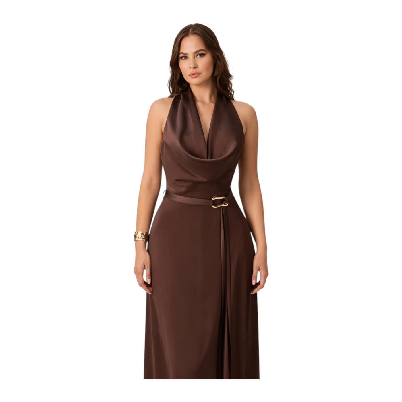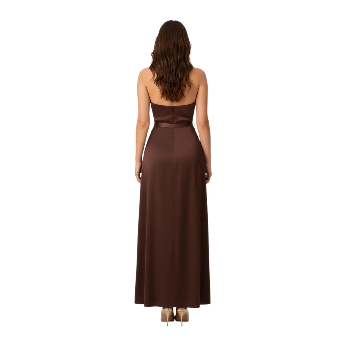 Il colore moka, romantico e luminoso, rende questo abito perfetto per eventi, cerimonie o look serali di grande impatto.
