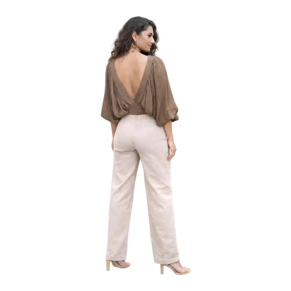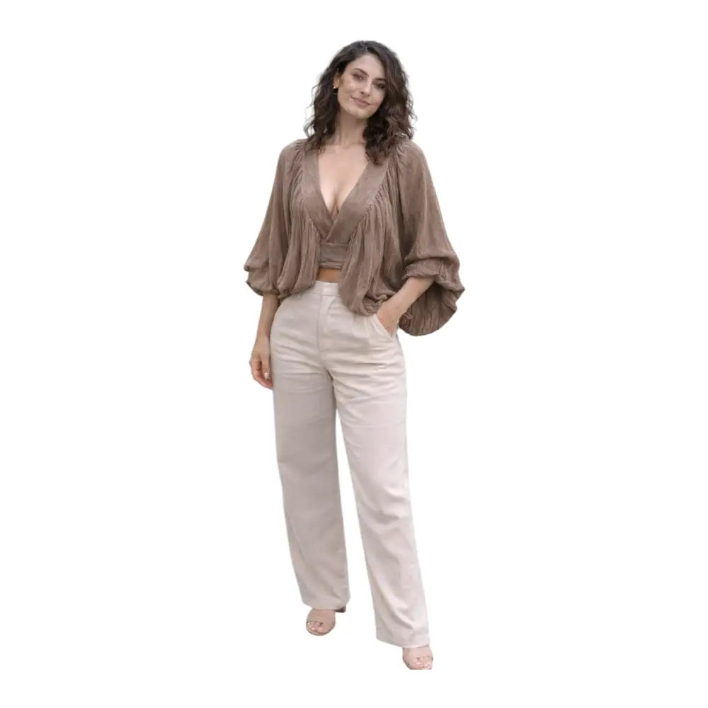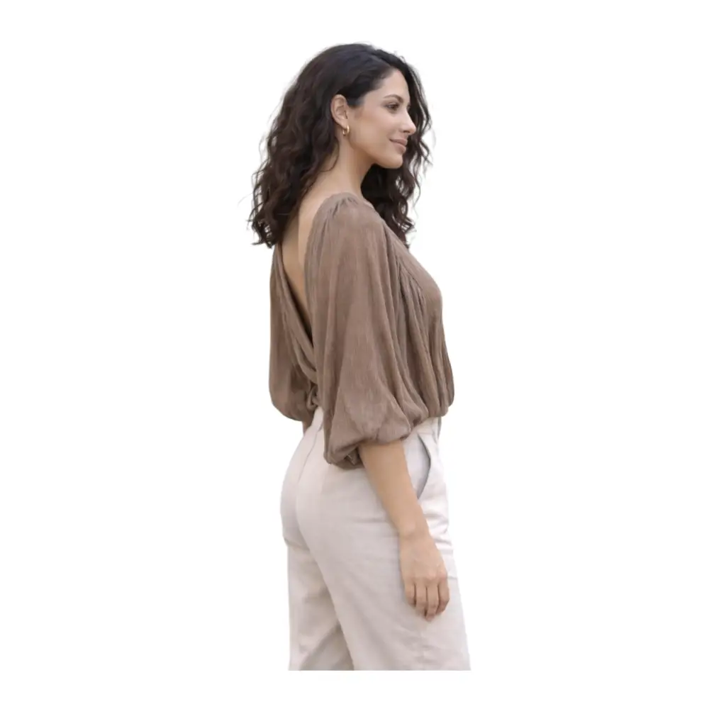 Realizzato in un tessuto fluido composto da 58% viscosa e 42% cupro, garantisce una vestibilità morbida e leggera, perfetta per accompagnare i movimenti con naturalezza. Le maniche ampie e drappeggiate donano volume e stile, rendendo il capo unico e ricercato.