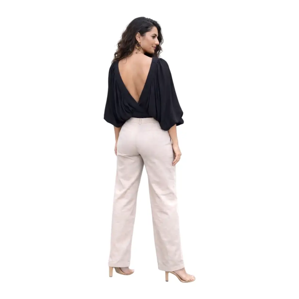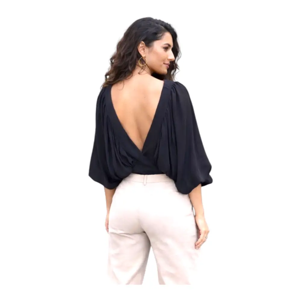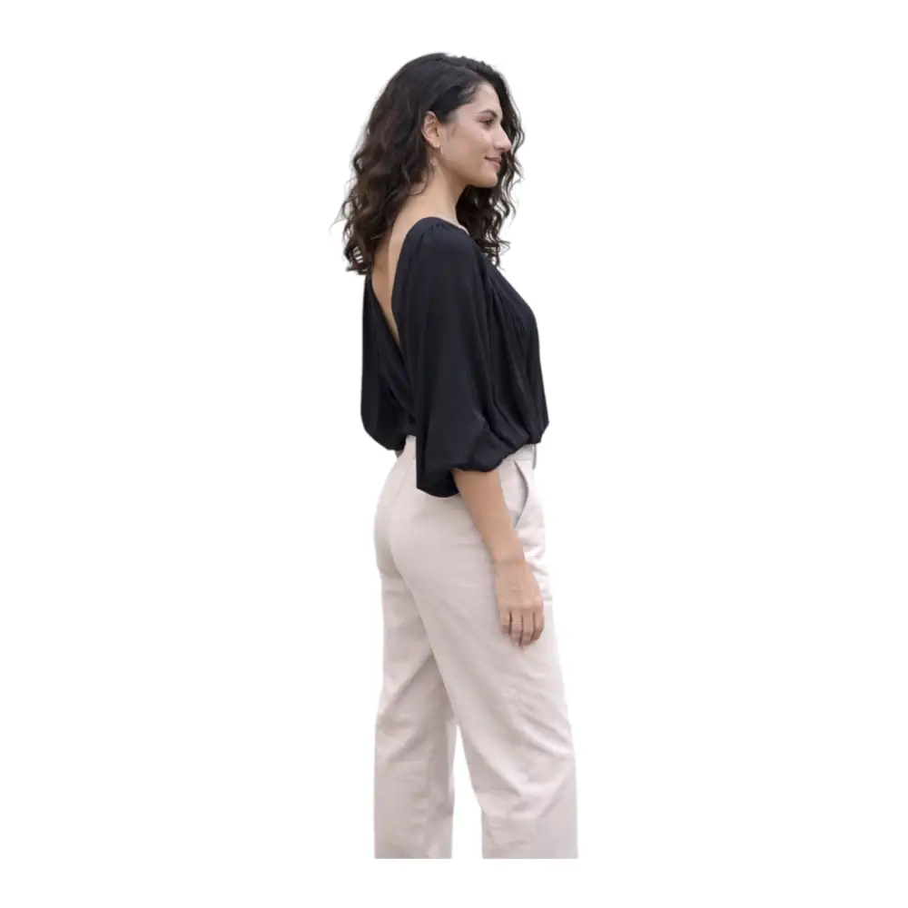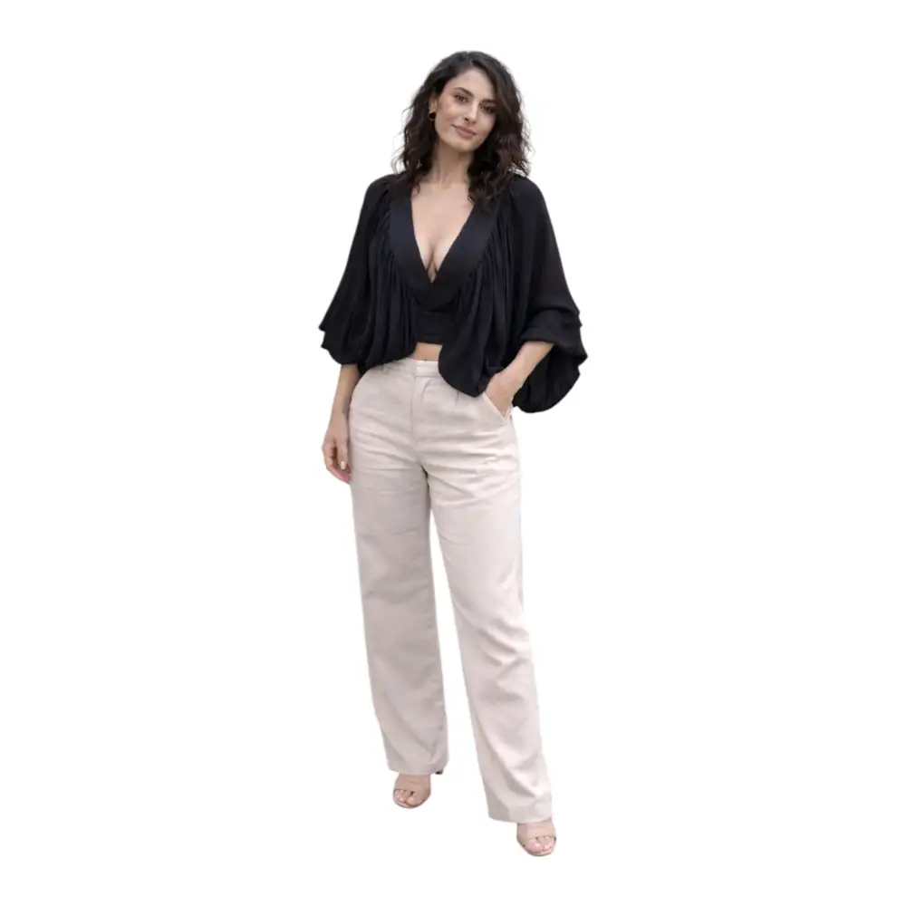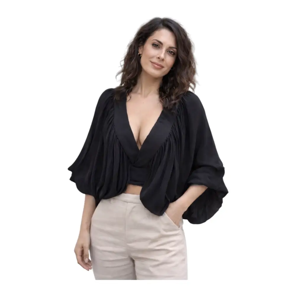 Realizzato in un tessuto fluido composto da 58% viscosa e 42% cupro, garantisce una vestibilità morbida e leggera, perfetta per accompagnare i movimenti con naturalezza. Le maniche ampie e drappeggiate donano volume e stile, rendendo il capo unico e ricercato.