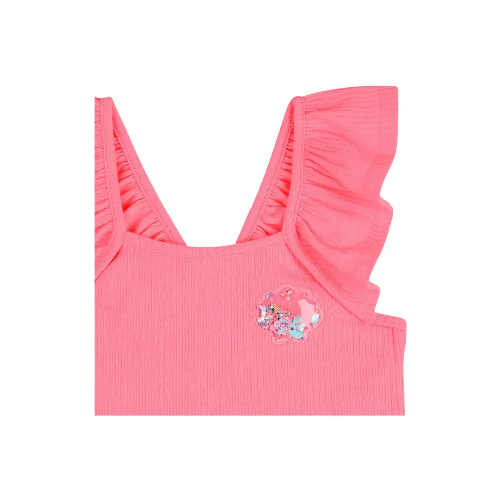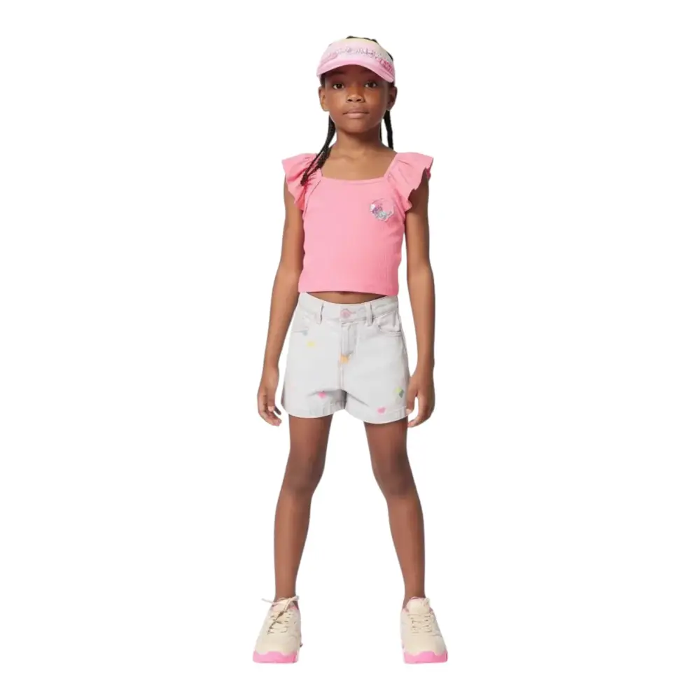 Sunny, questa canottiera a coste di BILLIEBLUSH ravviva il look delle bambine con le sue spalline arricciate che ruotano a ogni passo. Il suo distintivo abbellito da paillettes sul petto cattura giocosamente la luce, mentre la sua forma corta modernizza le silhouette estive. Il mio preferito da sovrapporre sopra pantaloncini a vita alta o una gonna fluente, per uno stile fresco, pieno di vivacità e fascino.